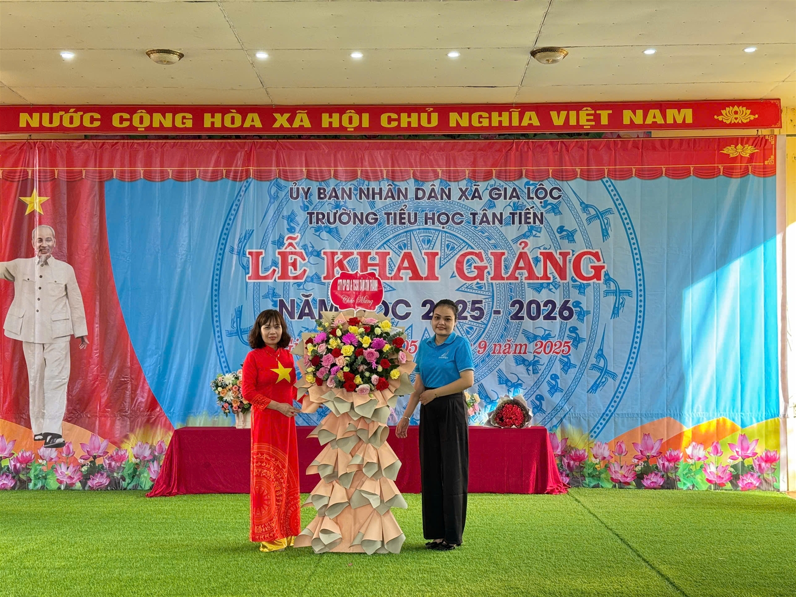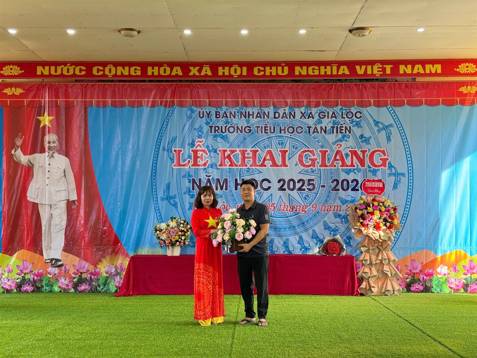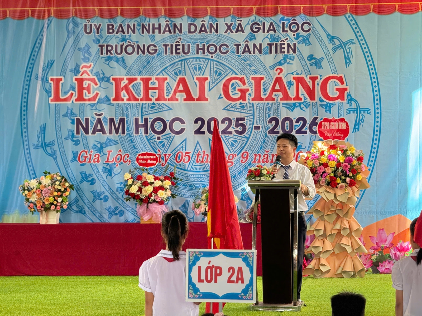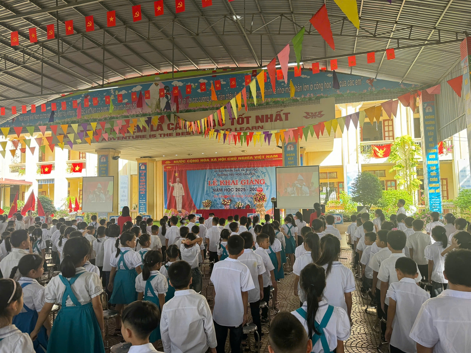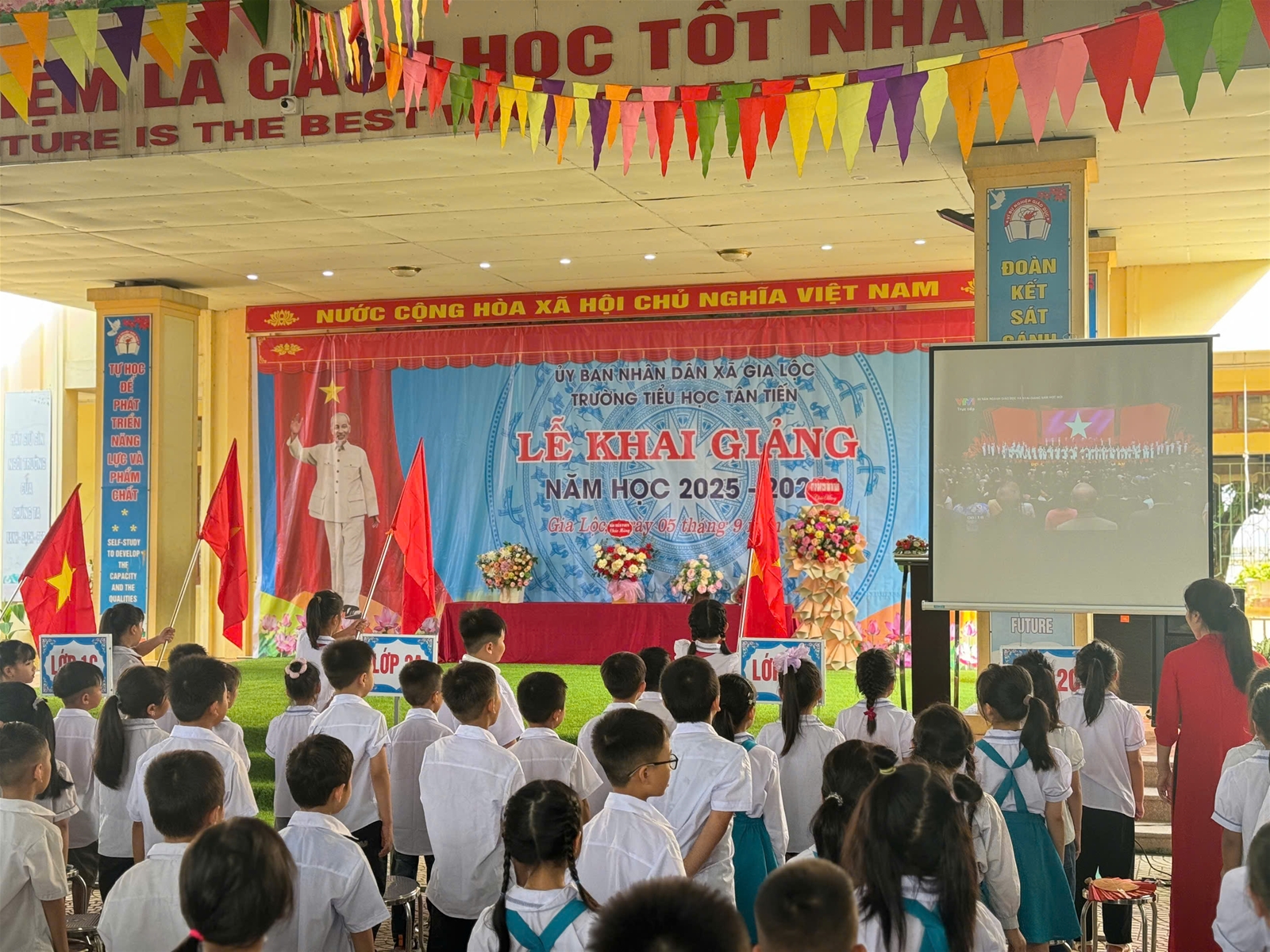 Ánh nắng chói chang của mùa hè đã lùi dần, tiếng ve cũng đã ngớt, màu đỏ của những bông hoa phượng lại nhường chỗ cho màu xanh tươi thắm. Vậy là một mùa hè bổ ích và lý thú lại trôi qua. Mùa thu đã về trên khắp đất nước Việt Nam mang theo không khí tưng bừng của một năm học mới. Những ngày đầu thu, trong niềm vui tươi, phấn khởi của người dân mọi miền Tổ quốc thi đua lập thành tích chào mừng 80 năm Cách mạng tháng Tám và Quốc khánh 02/9, hòa chung với niềm vui tưng bừng, náo nhiệt của tuổi trẻ học đường cả nước chào đón năm học mới, hôm nay mồng 5 tháng 9 năm 2025, Trường Tiểu học Tân Tiến long trọng tổ chức Lễ khai giảng năm học mới, năm học 2025 – 2026; dự lễ kỷ niệm 80 năm thành lập Bộ Quốc gia Giáo dục.
