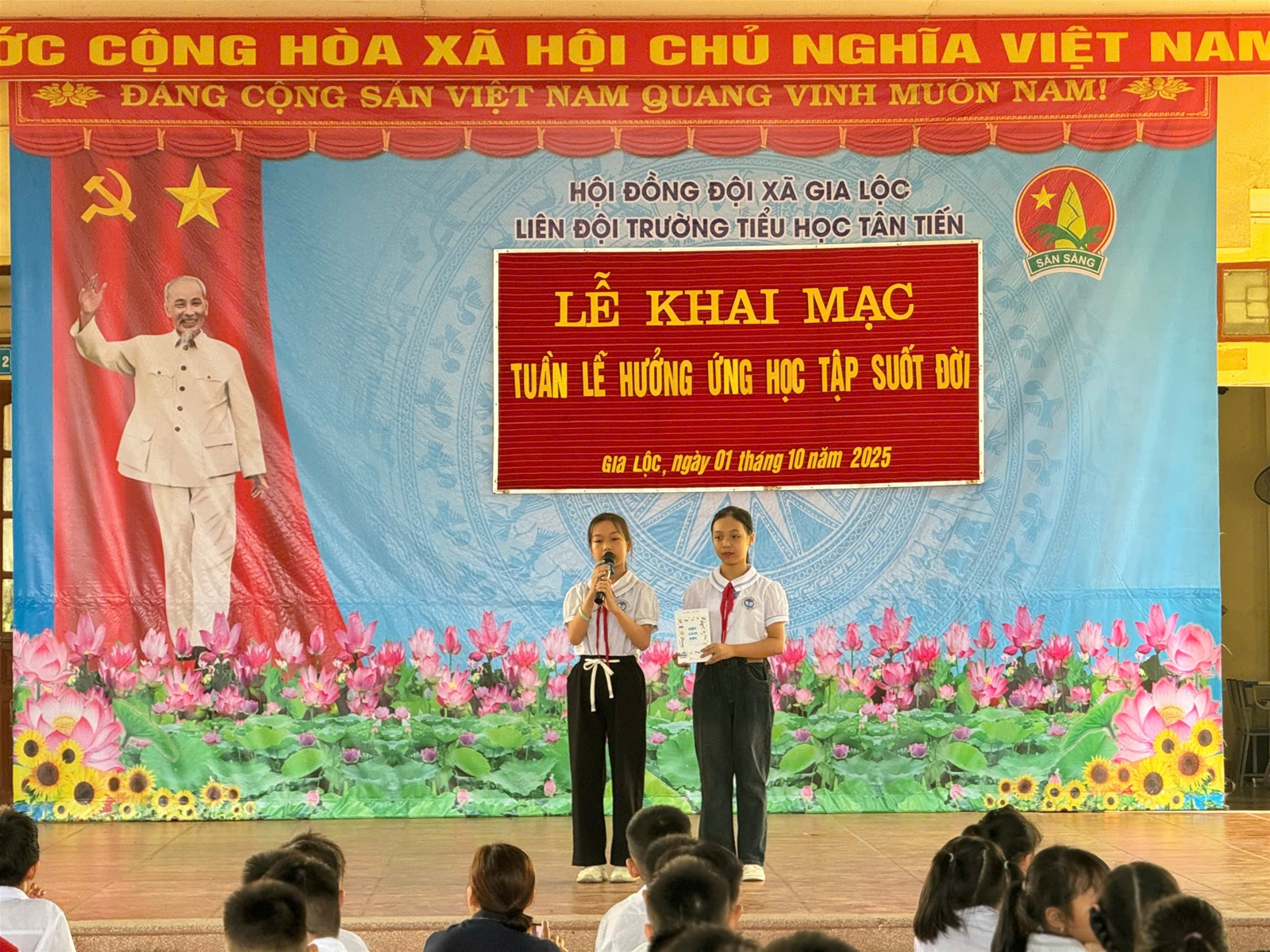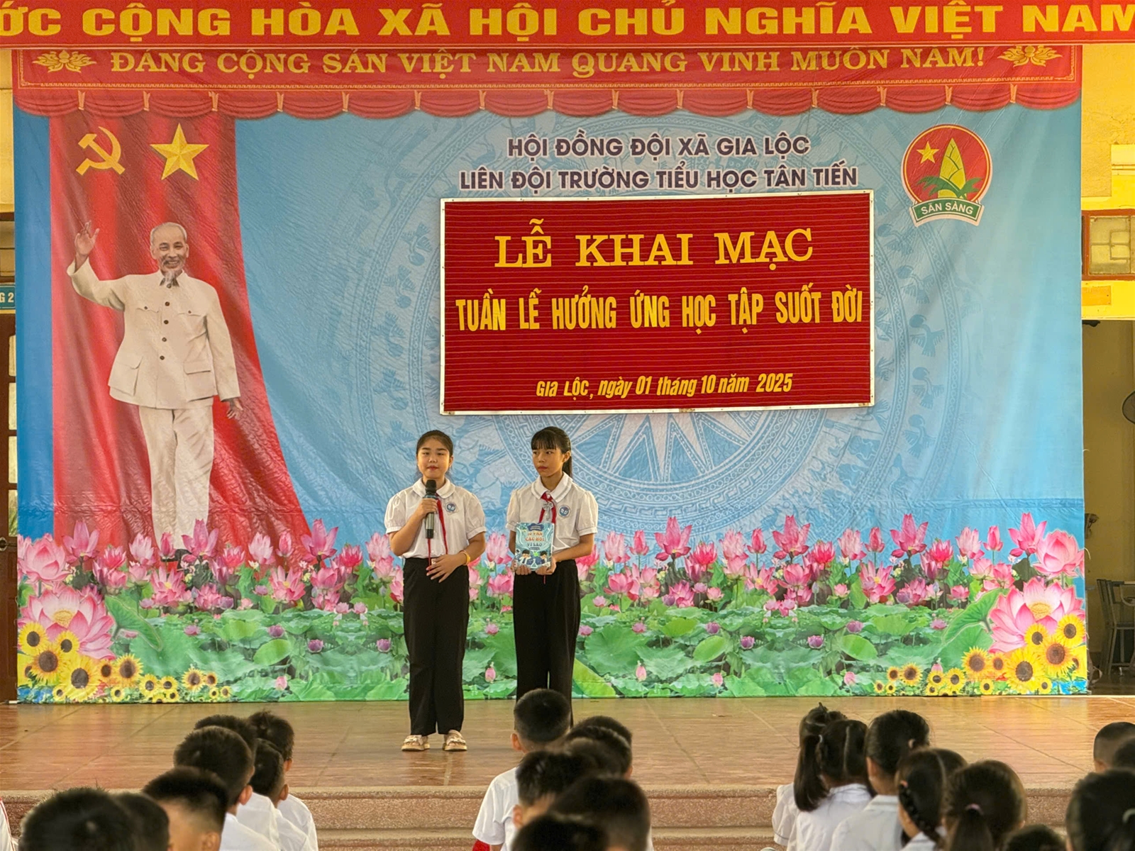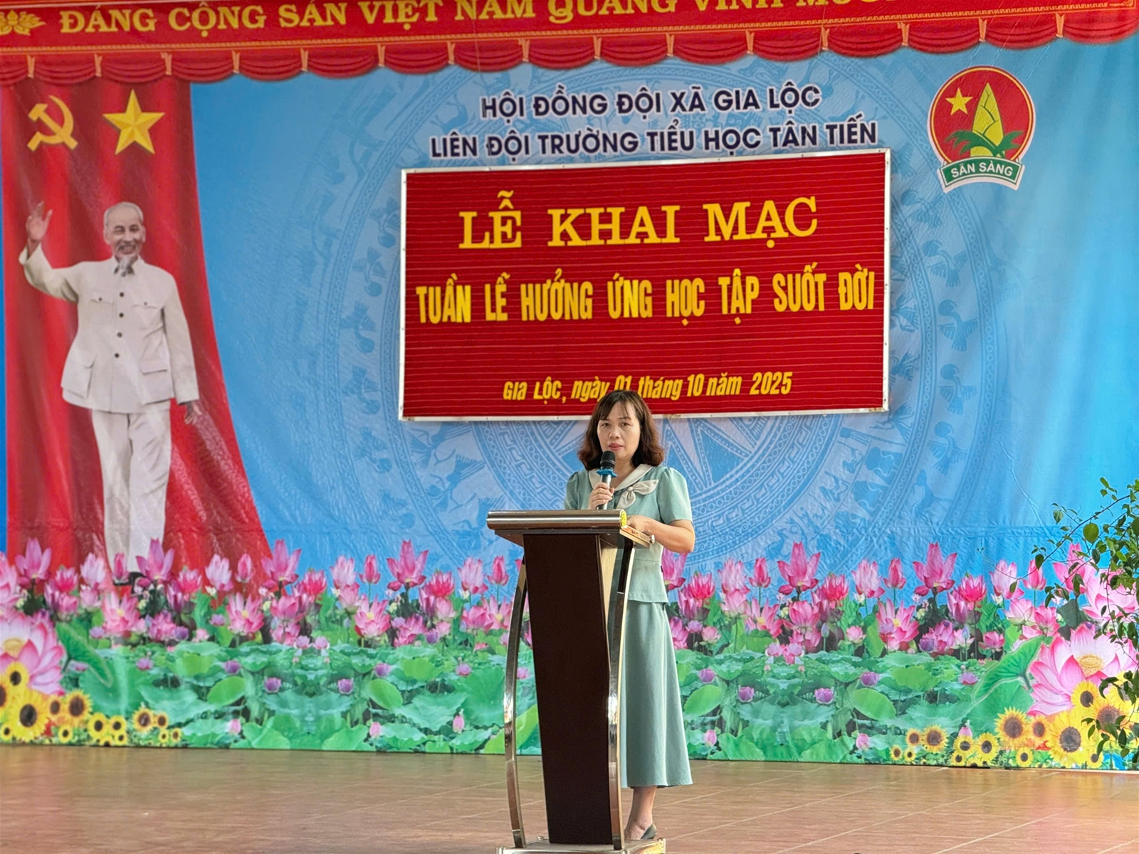 Thực hiện chỉ đạo của UBND xã Gia Lộc, thành phố Hải Phòng, sáng nay, 01 tháng 10 năm 2025, Trường Tiểu học Tân Tiến tưng bừng tổ chức Lễ khai mạc “Tuần lễ hưởng ứng học tập suốt đời” năm 2025 theo chủ đề “Học để phát triển bản thân, làm chủ tri thức và công nghệ, góp phần xây dựng đất nước hùng cường, thịnh vượng”, với sự tham dự của toàn thể các thầy cô giáo cùng 411 em học sinh của nhà trường.