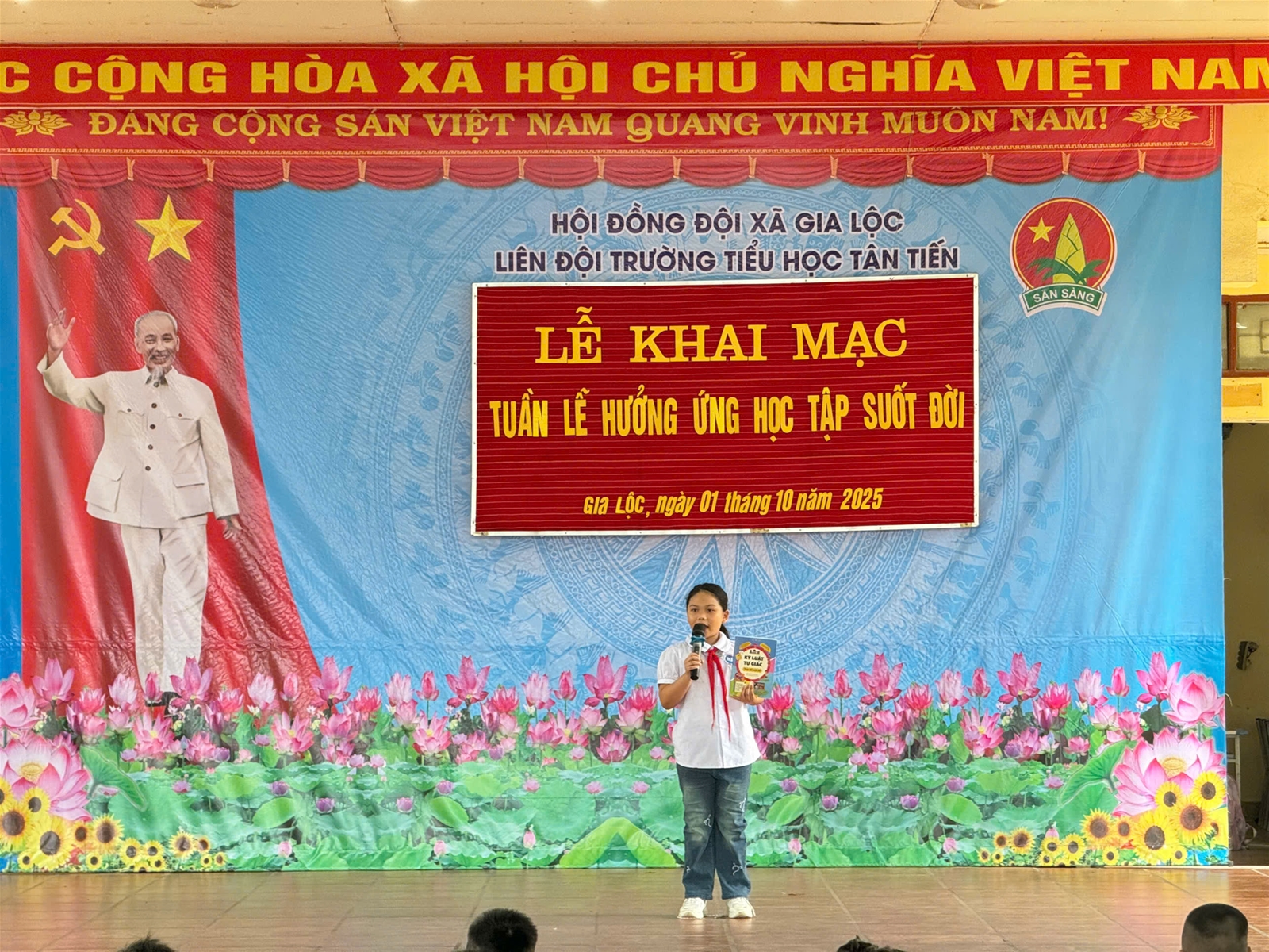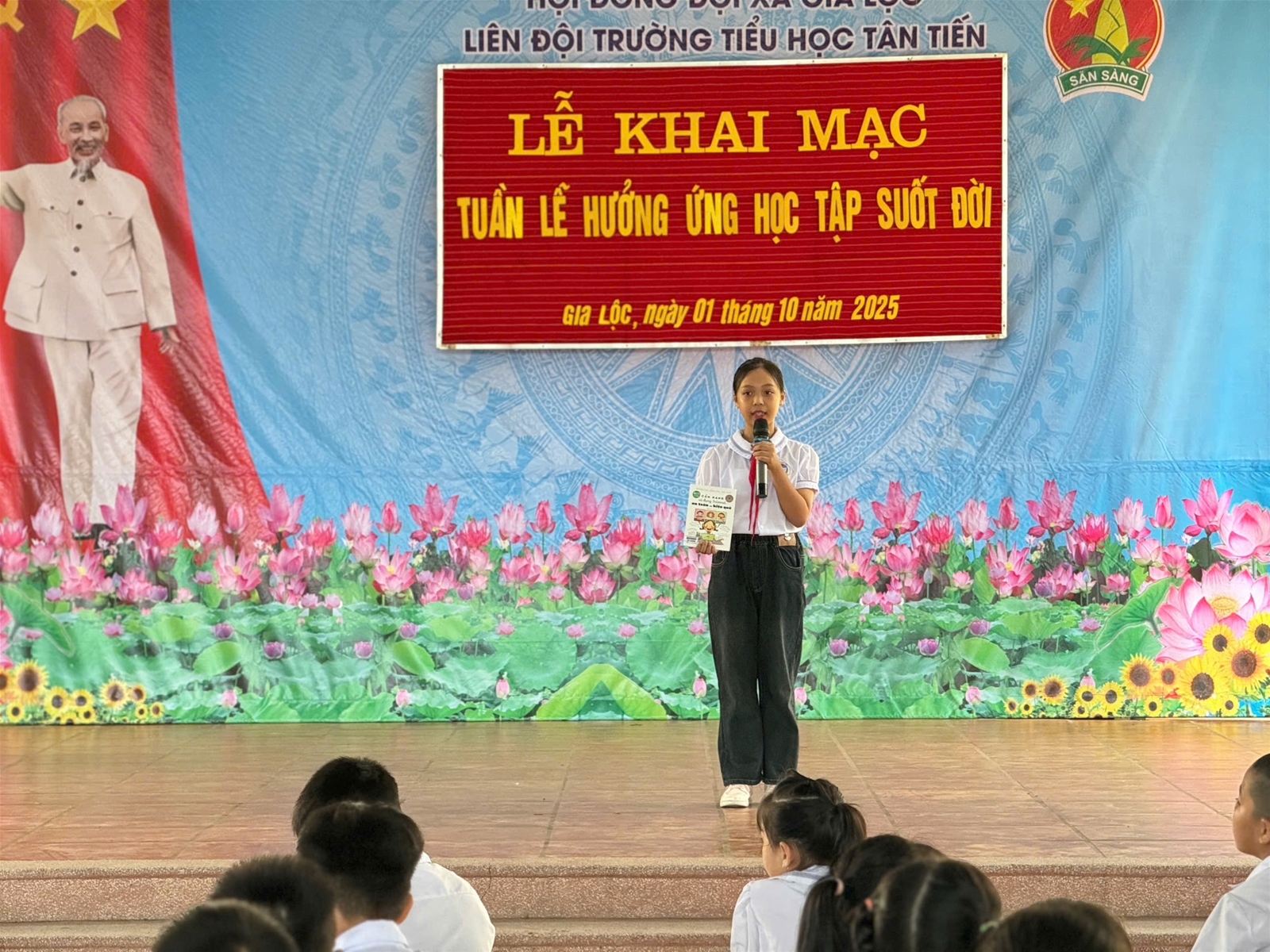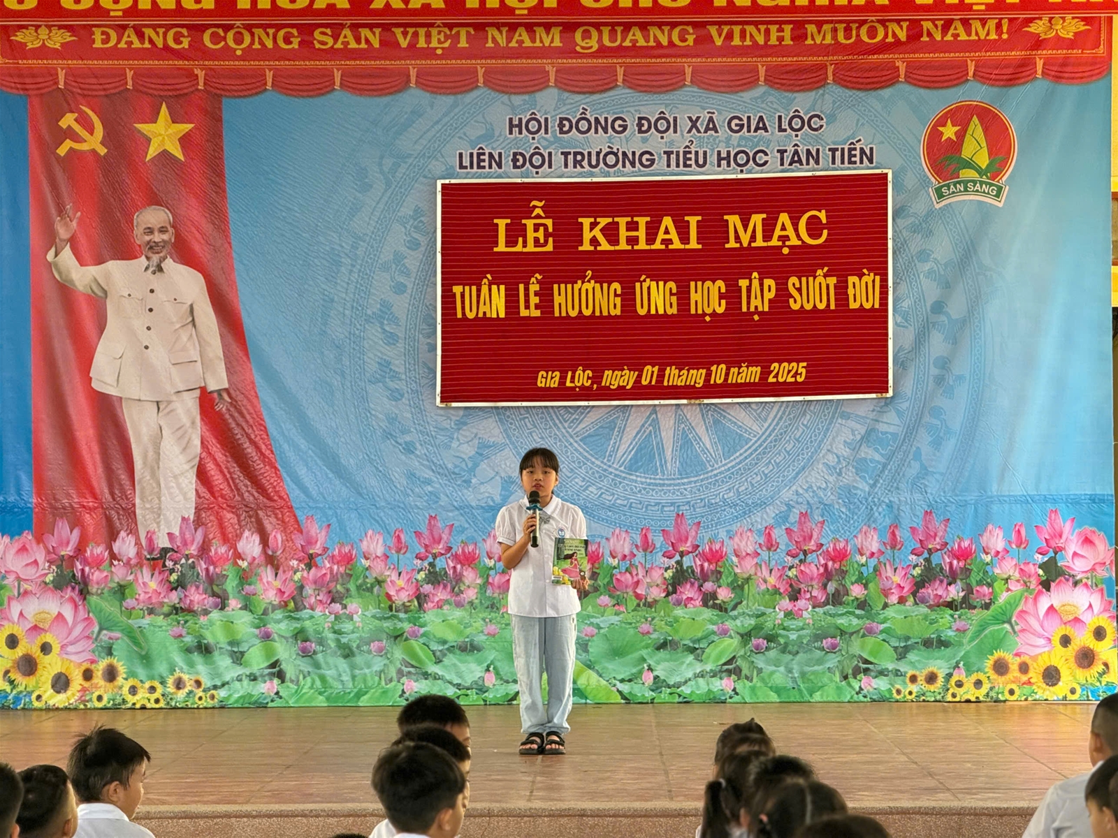 Với tinh thần đó, Cô phát động tất cả các em học sinh, các thầy cô giáo hãy tự giác, tích cực học tập và tự học. Trường Tiểu học Tân Tiến sẽ tổ chức nhiều hoạt động phong phú trong suốt Tuần lễ từ ngày 01 đến ngày 07/10/2025, như: sinh hoạt dưới cờ theo chủ đề, giao lưu giới thiệu sách, thi đố vui kiến thức, trải nghiệm STEM, tọa đàm… Tất cả nhằm tạo nên phong trào học tập sôi nổi, giúp các em học sinh thêm yêu thích việc học, rèn luyện kỹ năng, nuôi dưỡng ước mơ và khát vọng.