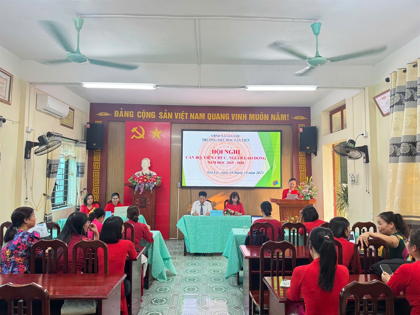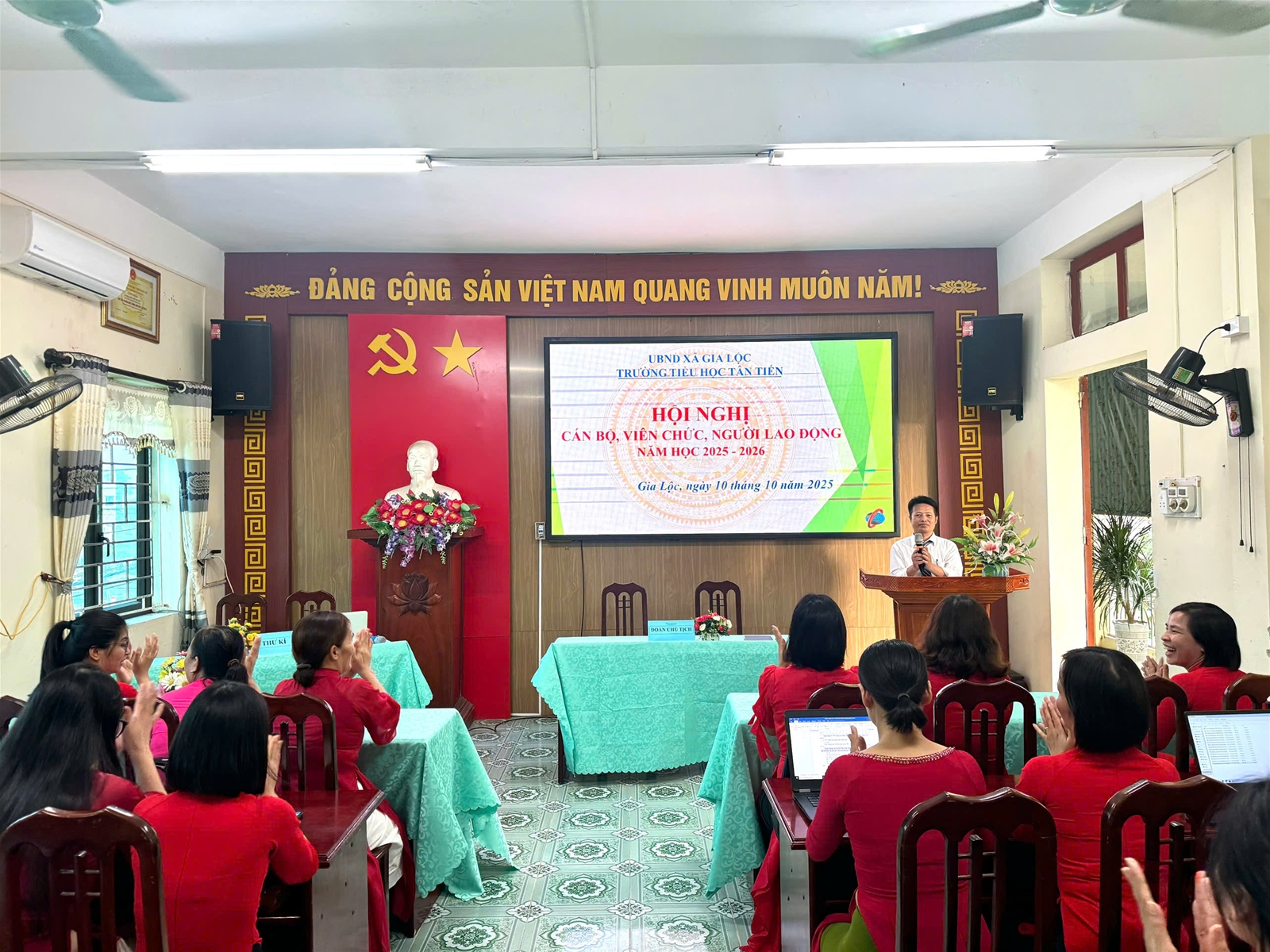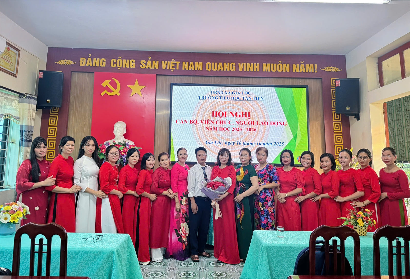Thực hiện Hướng dẫn số 7074/HD-SGDĐT ngày 25 tháng 9 năm 2025 của Sở giáo dục và Đào tạo về việc tổ chức Hội nghị cán bộ, viên chức, người lao động năm học 2025-2026; được sự nhất trí của Chi ủy, chiều ngày 10/10/2025, Trường Tiểu học Tân Tiến đã long trọng tổ chức Hội nghị cán bộ, viên chức, người lao động năm học 2025-2026.