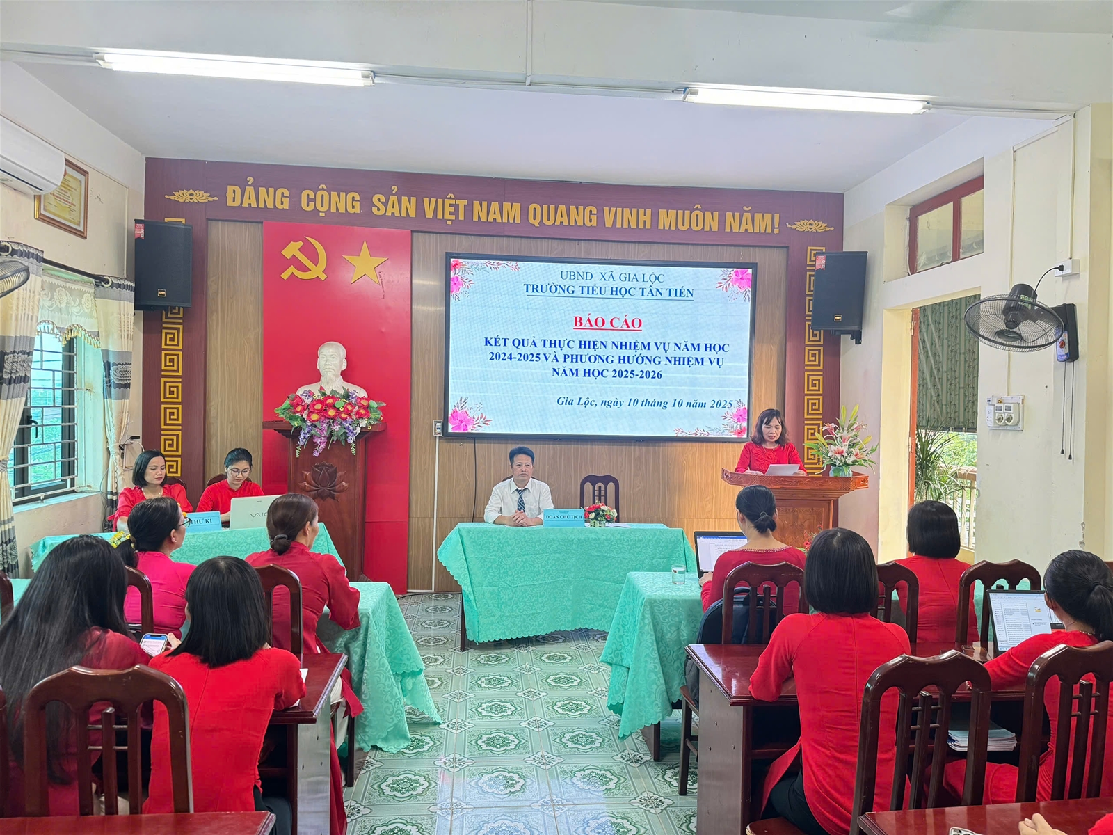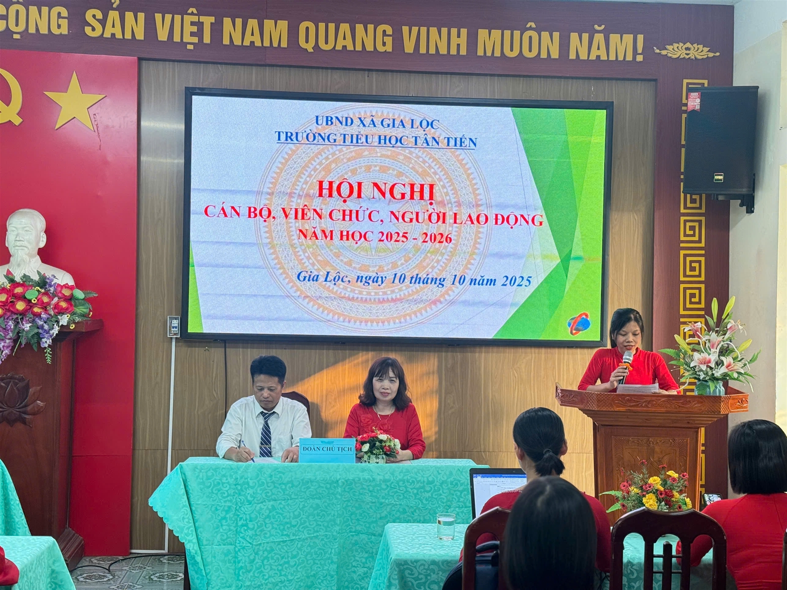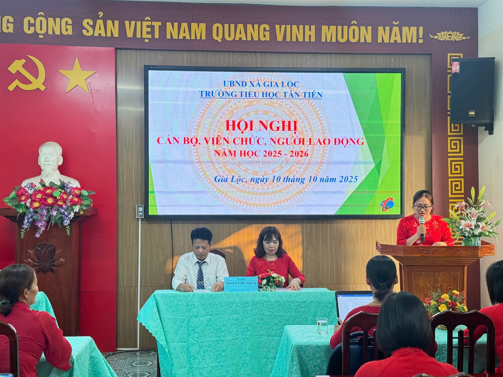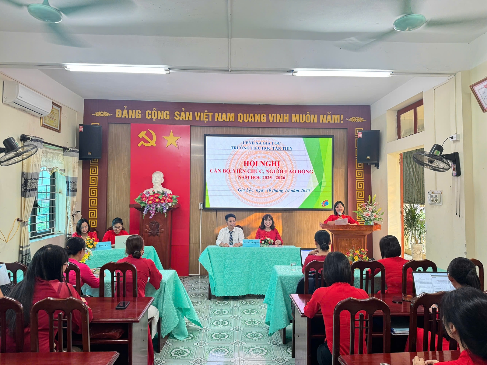 Thực hiện Hướng dẫn số 7074/HD-SGDĐT ngày 25 tháng 9 năm 2025 của Sở giáo dục và Đào tạo về việc tổ chức Hội nghị cán bộ, viên chức, người lao động năm học 2025-2026; được sự nhất trí của Chi ủy, chiều ngày 10/10/2025, Trường Tiểu học Tân Tiến đã long trọng tổ chức Hội nghị cán bộ, viên chức, người lao động năm học 2025-2026.