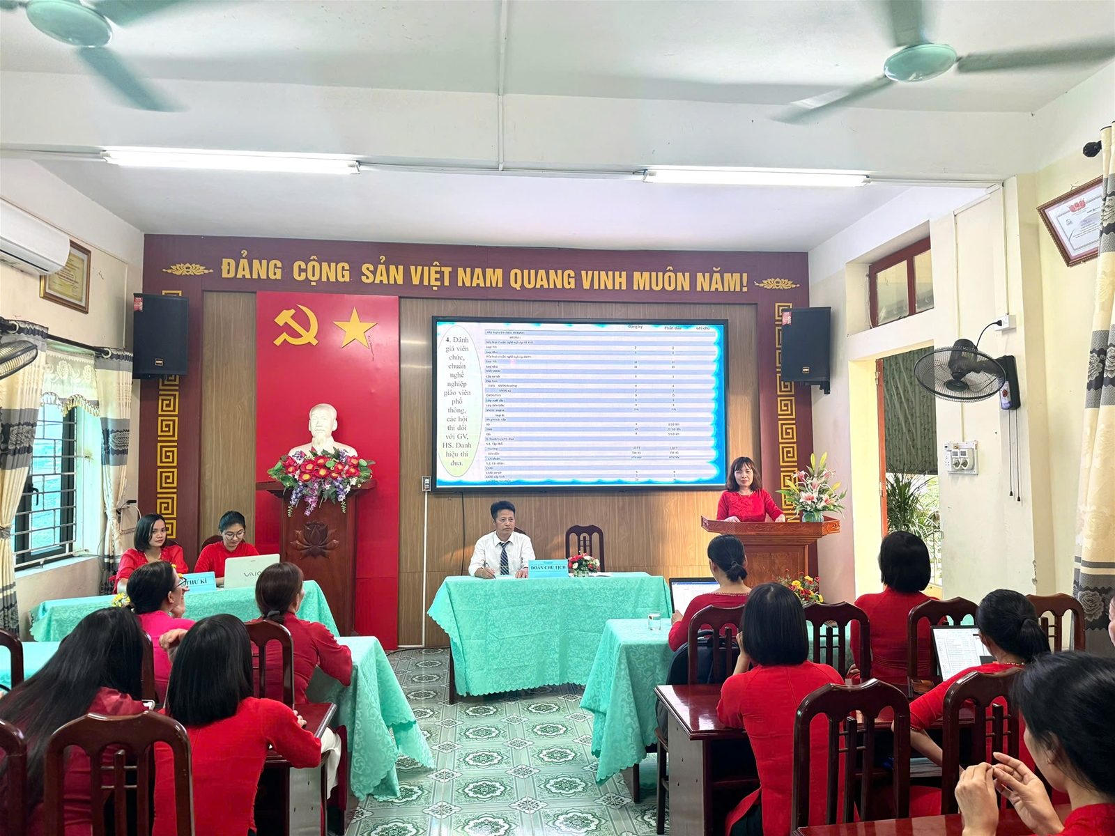Đồng chí Nguyễn Thị Thúy – Bí thư chi bộ, Hiệu trưởng nhà trường- thay mặt Đoàn Chủ tịch đã trình bày báo cáo kiểm điểm thực hiện Nghị quyết Hội nghị cán bộ viên chức, người lao động năm học 2024-2025.