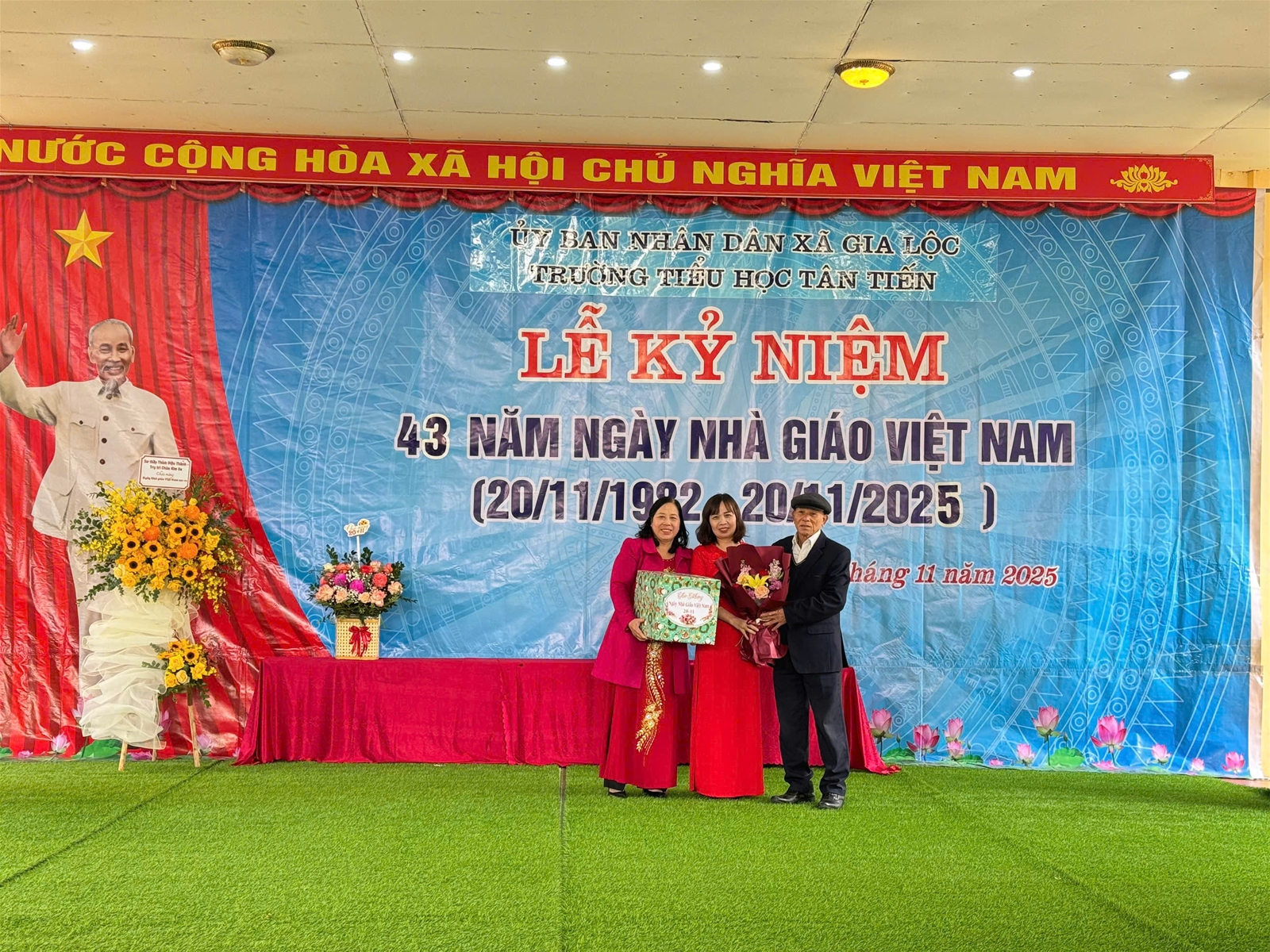 Tiếp theo là phần tặng hoa chúc mừng của các đại biểu và phần tặng hoa tri ân các thế hệ nhà giáo đã từng cống hiến tâm lực và trí lực cho sự nghiệp giáo dục nói chung và giáo dục xã Tân Tiến nói riêng.