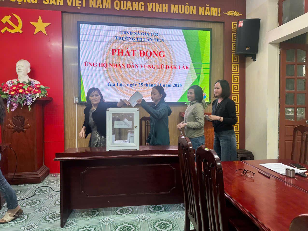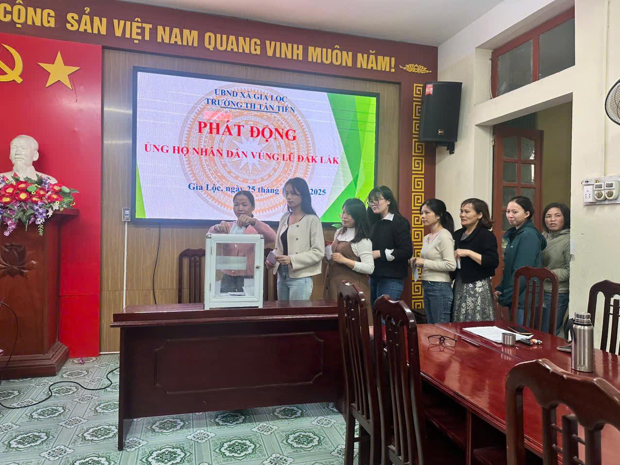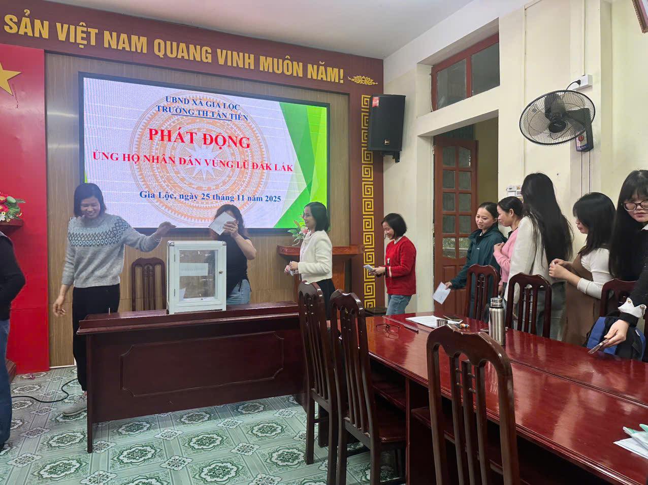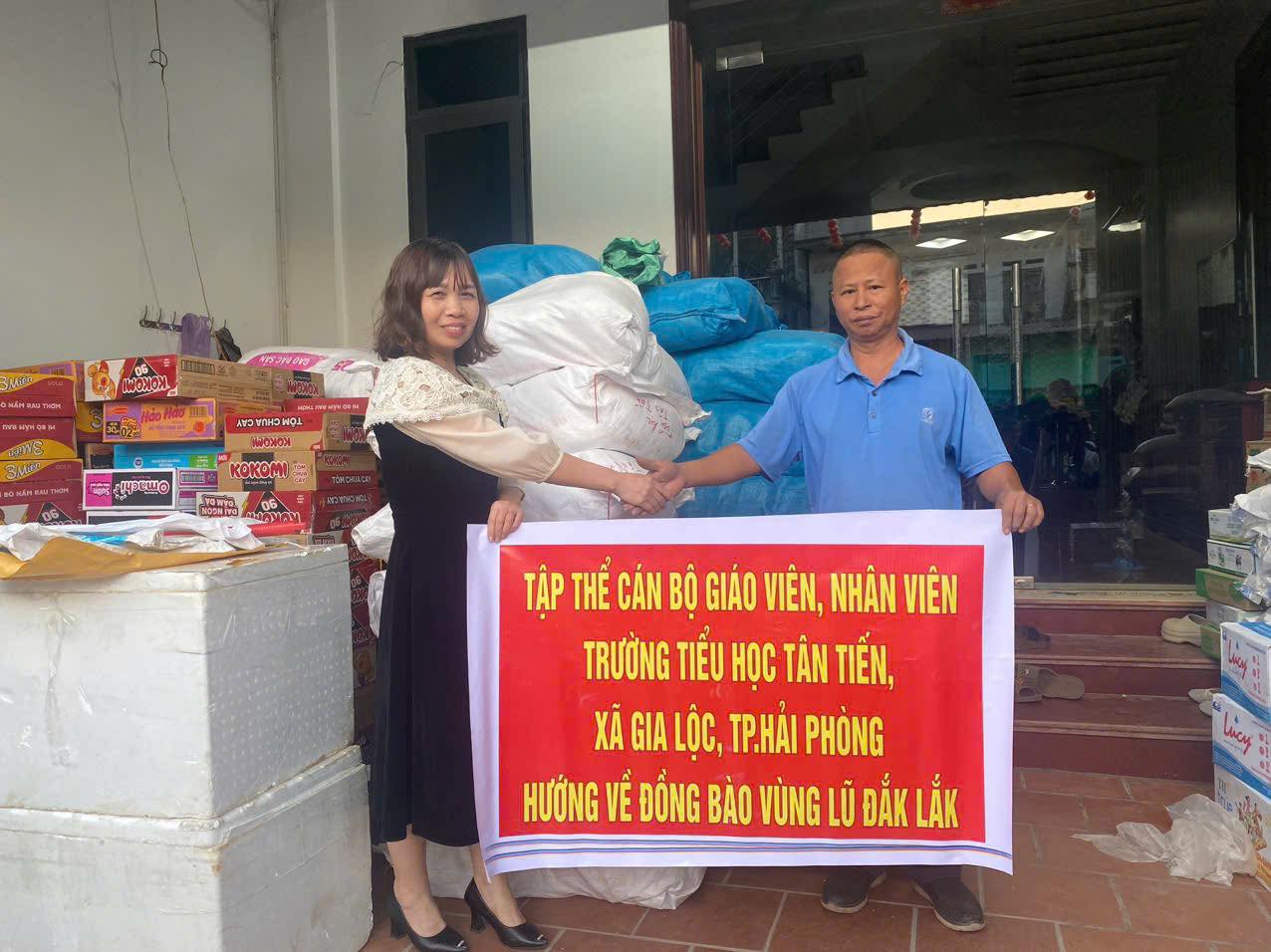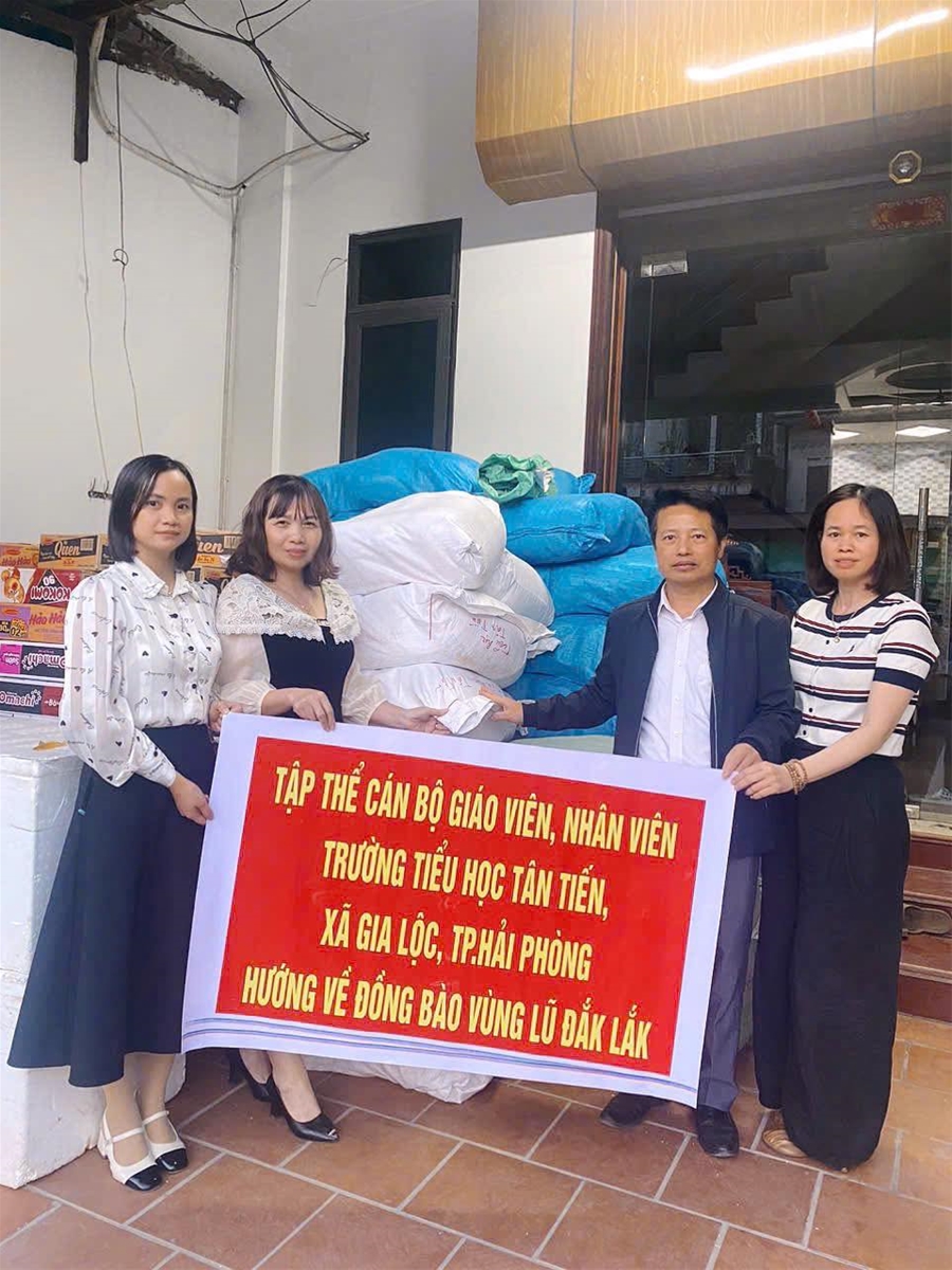 Thực hiện chủ trương của Bộ Chính trị và chỉ đạo của Thành ủy Hải Phòng; Công văn số 112-CV/BXĐĐ của Đảng ủy xã Gia Lộc về việc đẩy mạnh tuyên truyền, vận động hỗ trợ khắc phục hậu quả mưa lũ tại Đắk Lắk, tập thể cán bộ, giáo viên và nhân viên Trường Tiểu học Tân Tiến phát huy tinh thần trách nhiệm, lòng nhân ái và truyền thống tốt đẹp của ngành giáo dục trong các hoạt động thiện nguyện.
