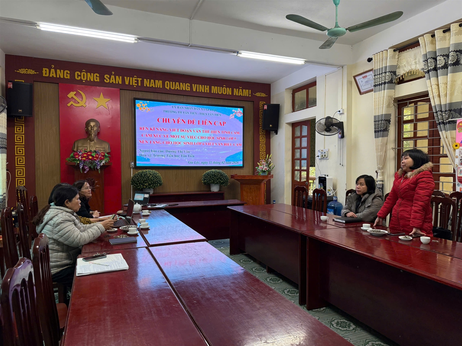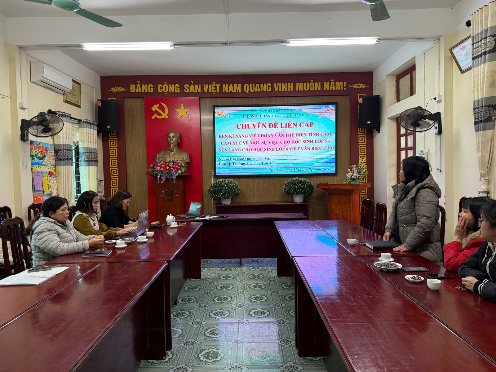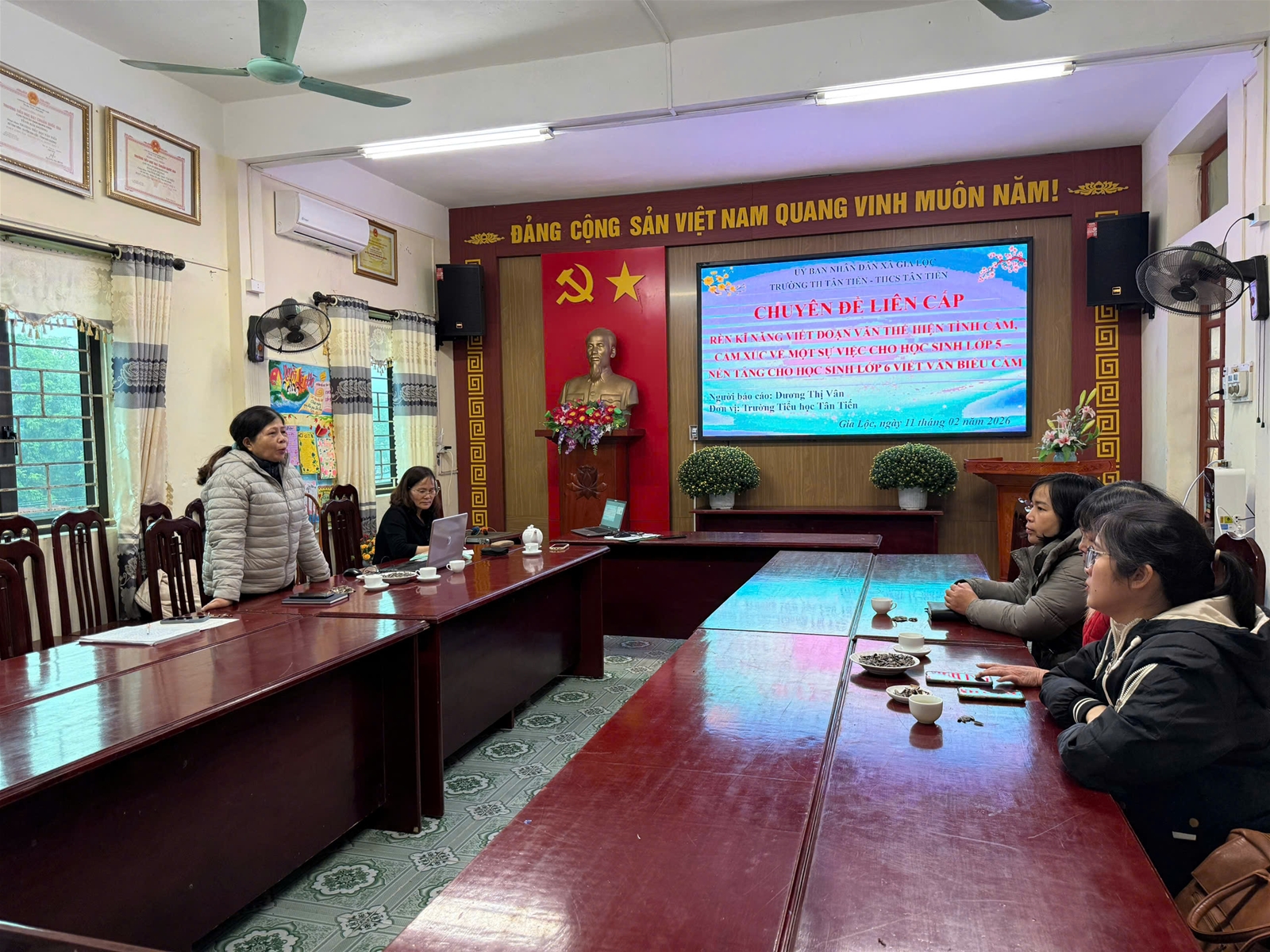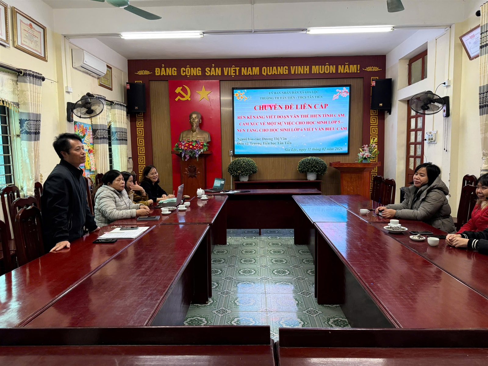 Chiều ngày 11/02/2026, tại Trường Tiểu học Tân Tiến, hai nhà trường Tiểu học và THCS Tân Tiến đã tổ chức thành công chuyên đề liên cấp với chủ đề: Rèn kĩ năng viết đoạn văn thể hiện tình cảm, cảm xúc về một sự việc cho học sinh lớp 5 – nền tảng vững chắc cho học sinh lớp 6 viết văn biểu cảm. Tham dự chuyên đề có lãnh đạo hai nhà trường, giáo viên Tổ 4, 5 Trường Tiểu học Tân Tiến cùng giáo viên Ngữ văn lớp 6 Trường THCS Tân Tiến. Buổi sinh hoạt chuyên môn diễn ra trong không khí nghiêm túc, cởi mở, tập trung trao đổi các giải pháp nâng cao chất lượng dạy học viết văn biểu cảm theo định hướng Chương trình GDPT 2018.