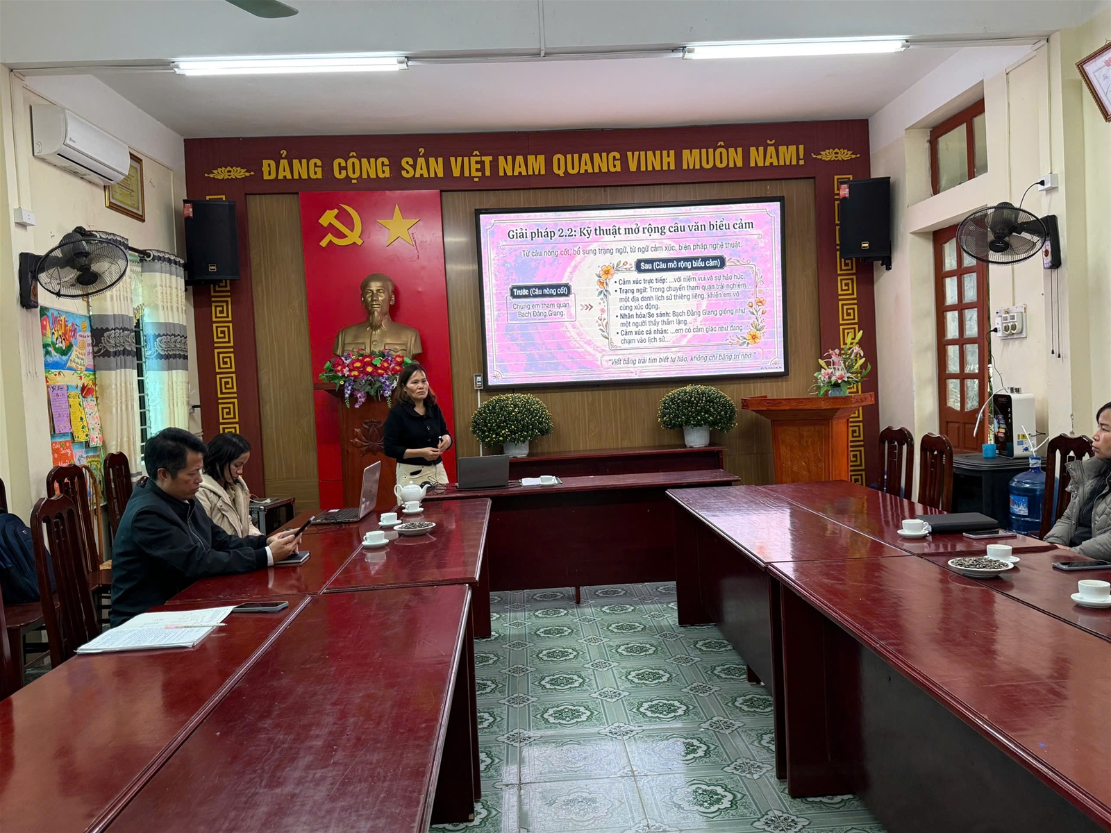 Sau phần dự giờ, cô Dương Thị Vân đã trực tiếp báo cáo nội dung lý thuyết chuyên đề, tập trung làm rõ thực trạng dạy và học viết đoạn văn biểu cảm hiện nay, đồng thời chia sẻ các giải pháp rèn kĩ năng cho học sinh như: giúp học sinh hiểu đúng “sự việc” để viết đúng trọng tâm; mở rộng vốn từ biểu cảm qua các phân môn Tiếng Việt; tổ chức hoạt động trải nghiệm cảm xúc; rèn kĩ năng nói – nghe trước khi viết; hướng dẫn học sinh xây dựng đoạn văn theo cấu trúc ba phần rõ ràng. Báo cáo cũng nhấn mạnh vai trò của việc ứng dụng công nghệ và AI như một công cụ hỗ trợ hiệu quả trong việc khơi gợi cảm xúc, tổ chức hoạt động học và nâng cao chất lượng dạy học.