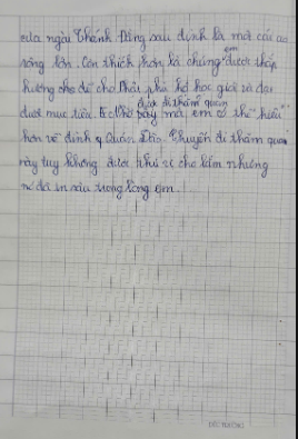 Trở về lớp học thân quen, dư âm của chuyến đi vẫn còn nguyên vẹn trong tâm trí các em.Các em đã viết những đoạn văn thể hiện tình cảm, cảm xúc về buổi trải nghiệm ý nghĩa.